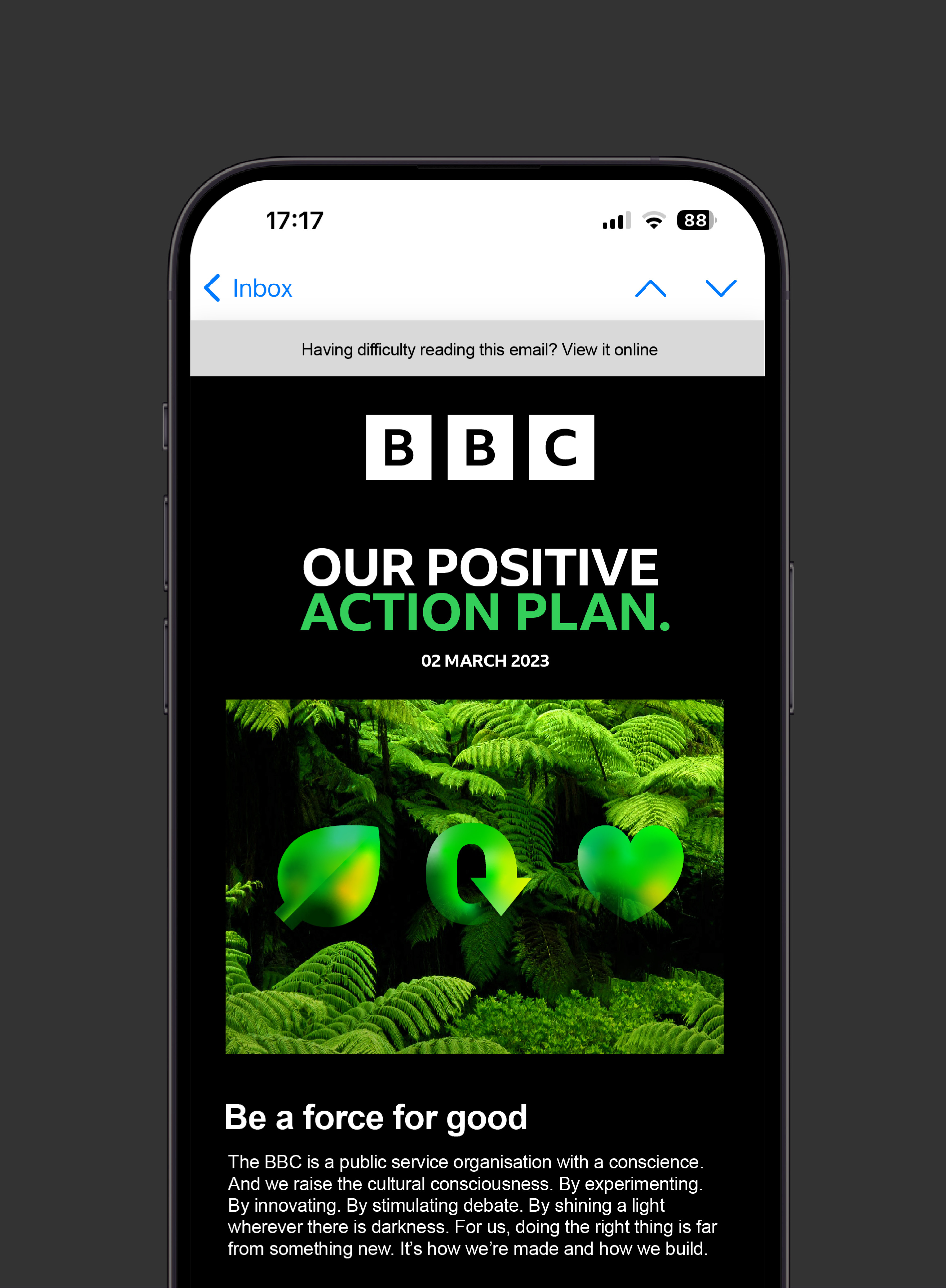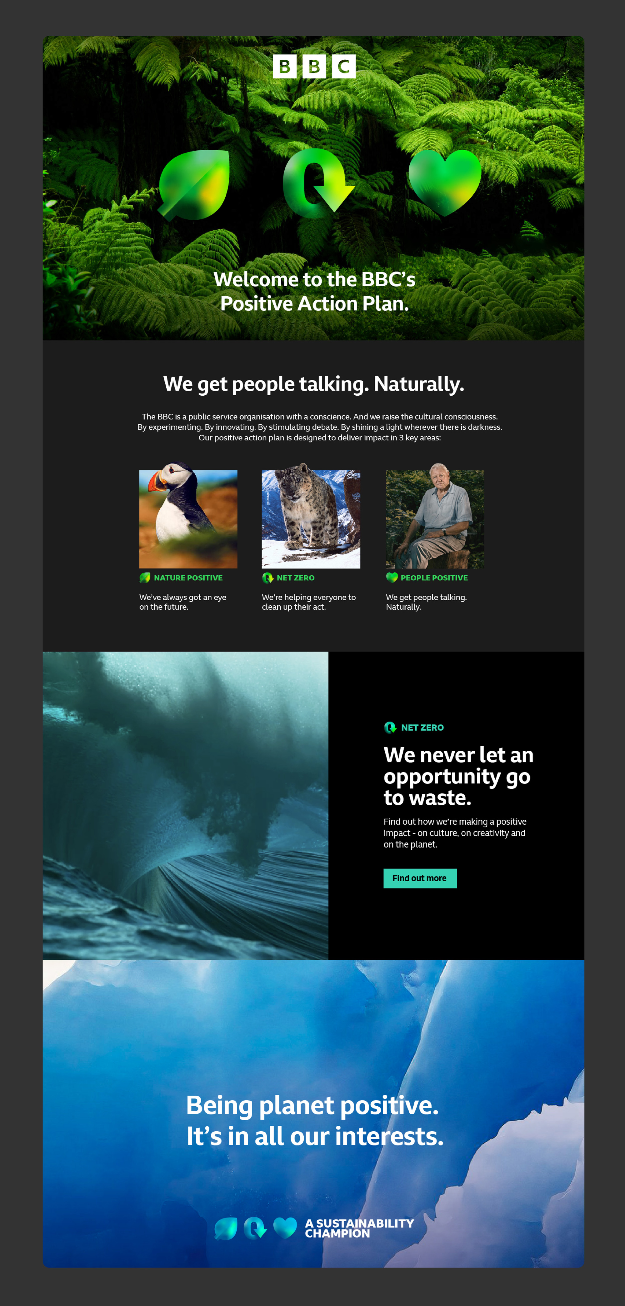 In response to the global climate crisis, the BBC set out a bold ambition: to reach Net Zero by 2050. To communicate this commitment, it launched the Net Zero Transition Plan. A campaign was developed to bring the plan to life—built around three core pillars: Nature Positive, Net Zero, and People Positive. The aim was to create a clear, recognisable system that could be used across internal and external channels.
